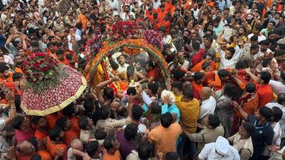 सीएम हेलीकॉप्टर से बरसाते रहे पुष्प, भक्त झूम उठे