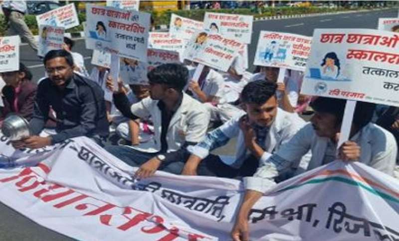 भोपाल : मध्यप्रदेश की नर्सिंग छात्राओं ने अपने प्रवेश और भविष्य को लेकर भारतीय राष्ट्रीय छात्र संगठन के नेतृत्व में प्रदर्शन किया। पुलिस प्रशासन ने प्रदर्शन कर रहें एनएसयूआईं पदाधिकारियों और छात्राओं को विधानसभा जाने से रोक तो उन्होंने तेज बारिश में बीच सड़क पर बैठ कर प्रदर्शन किया पुलिस ने एनएसयूआई प्रदेश उपाध्यक्ष रवि परमार जिला अध्यक्ष अक्षय तोमर अभय रामभक्त सचिन भदौरिया सहित कई पदाधिकारियों को हिरासत में लिया ।