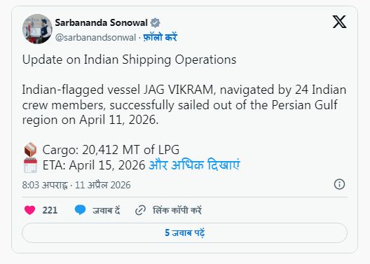 जानकारी के अनुसार, जहाज ओमान की खाड़ी को पार कर गया है. जग विक्रम की क्षमता करीब 26,000 टन की है. स्ट्रेट ऑफ होर्मुज बंद होने की वजह से यह जहाज कई दिनों से फंसा था. जो सीजफायर के ऐलान होते ही होर्मुज से रवाना हो गया है. होर्मुज बंद होने की वजह से भारत समेत दुनियाभर में गैस की किल्लत देखने को मिलने लगी थी.